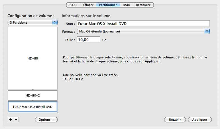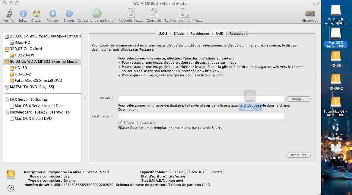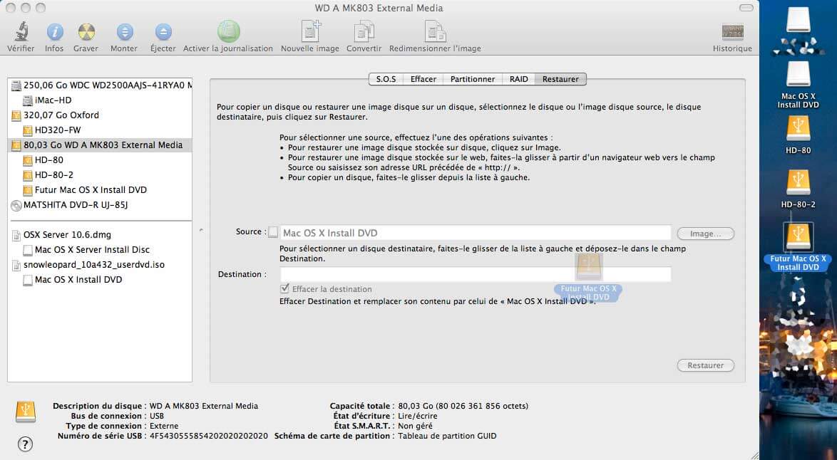 Une fois votre partition de destination prĂȘte, il faut avoir sa source (image disque, ou DVD), ainsi que sa destination (partition voulue) de montĂ©es (disponible dans le Finder).
