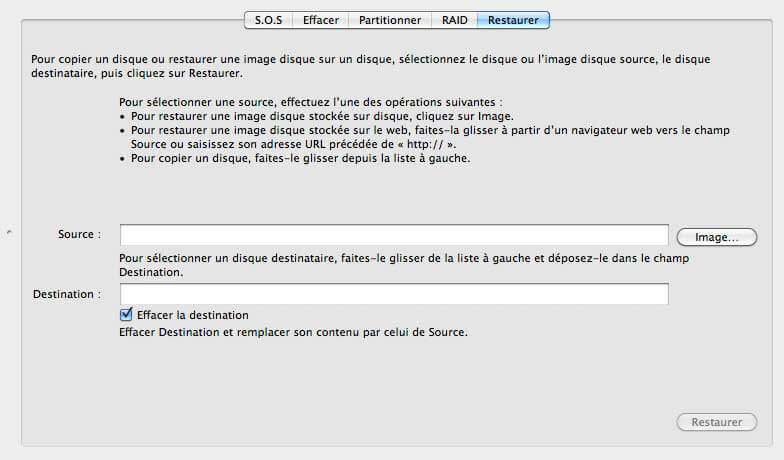 Dirigez-vous maintenant vers l’onglet Restauration de l’Utilitaire de disque.